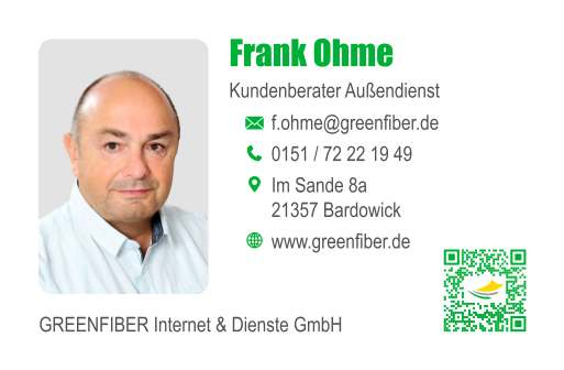 Herr Frank Ohme Tel.: +49 1517 2221949, f.ohme@greenfiber.de, Dienstag und Donnerstag von 9 bis 17:30 Uhr mit Rat und Tat zur Seite.